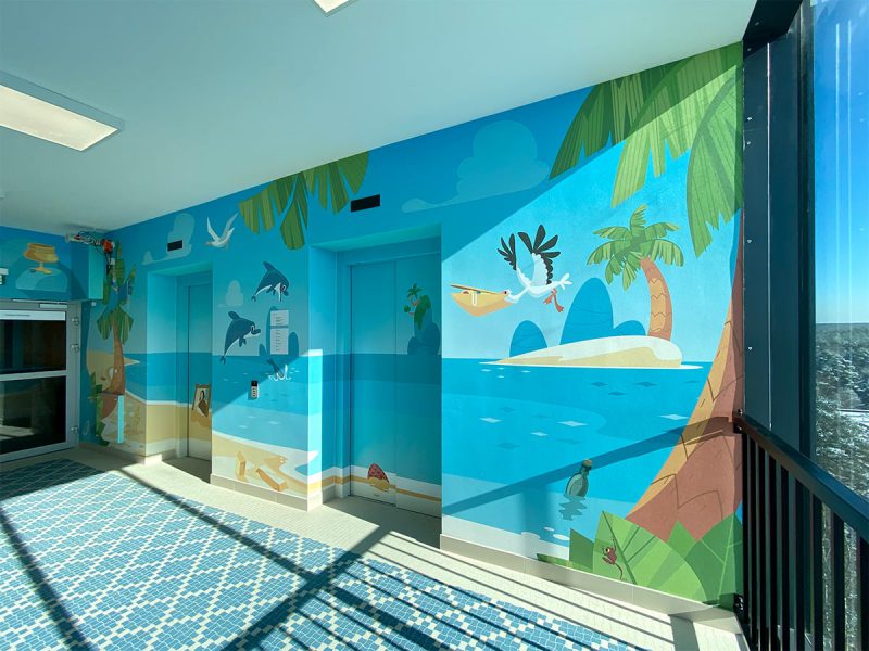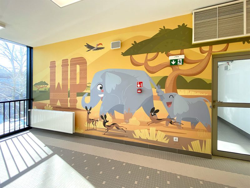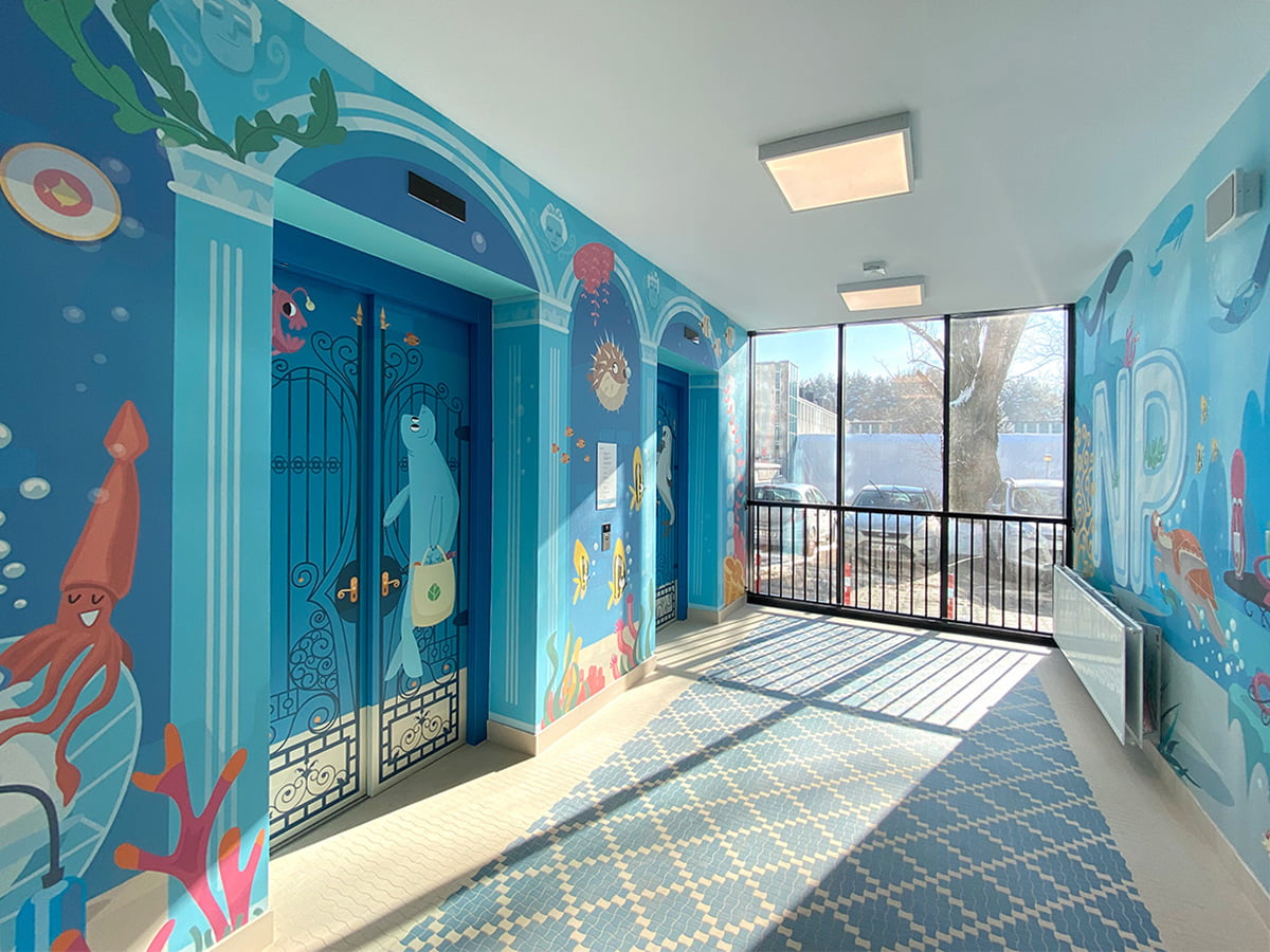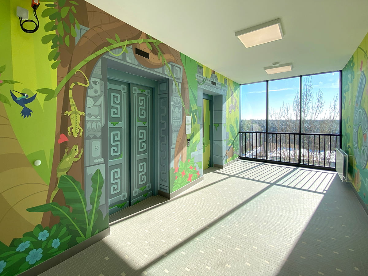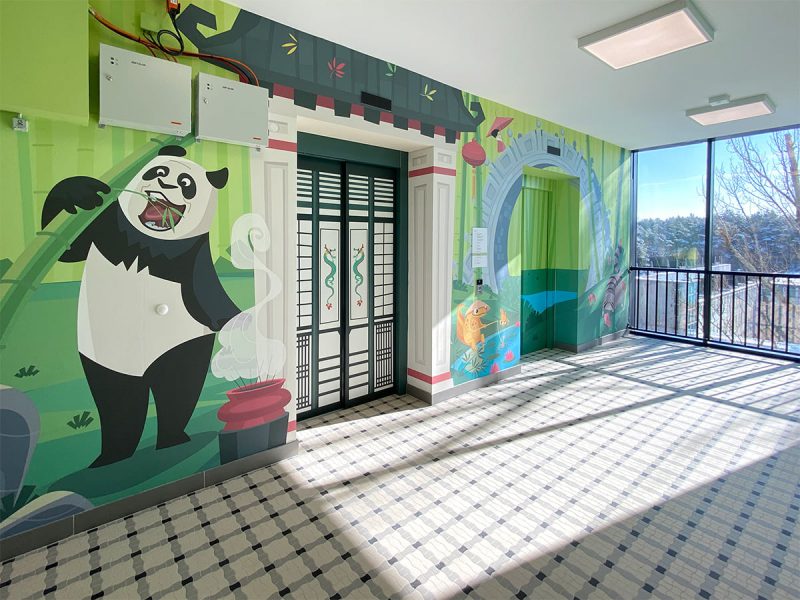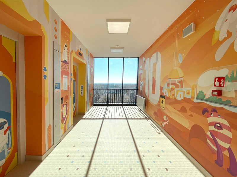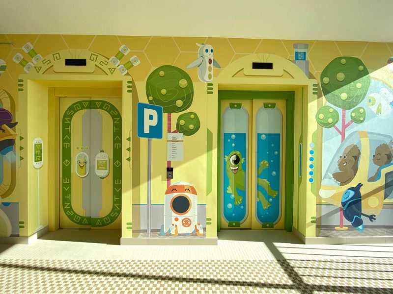 Zapraszamy do magicznej podróży! Na 12 poziomach strefy wind głównego budynku Centrum Zdrowia Dziecka powstały bajeczne krainy. Mali podróżnicy mogą odwiedzić między innymi: Podwodne Królestwo, Kocie Miasto, Madagaskar, Wyspę Skarbów czy też Mars. Wnętrza wind zostały przekształcone w latający pojazd i odrzutowiec. To dopiero będzie wyprawa! Łącznie zainstalowaliśmy ponad 800m2 specjalistycznych tapet z autorskimi ilustracjami. Uroku dodaje posadzka z przepięknej mozaiki indywidualnie dobrana do każdego z pięter.